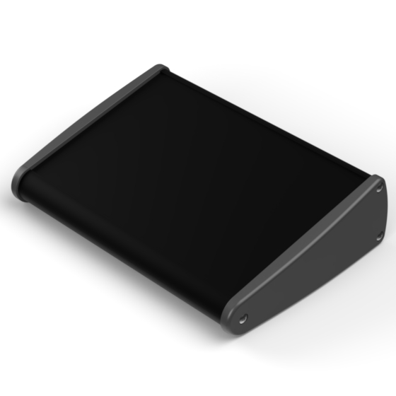 Inclined extruded aluminium case with high quality painted finishing. Two ABS side panels, internal guides for PCB, recessed area for membrane keypad.Closing by six screws. Two colours combinations: black RAL 9004 / grey RAL 7012 - white RAL 9002 / light grey RAL 9018. Upon request wall-suspension element “MT7.0”.