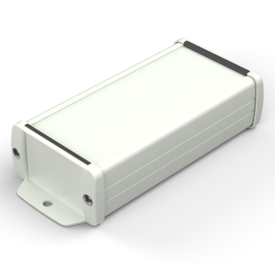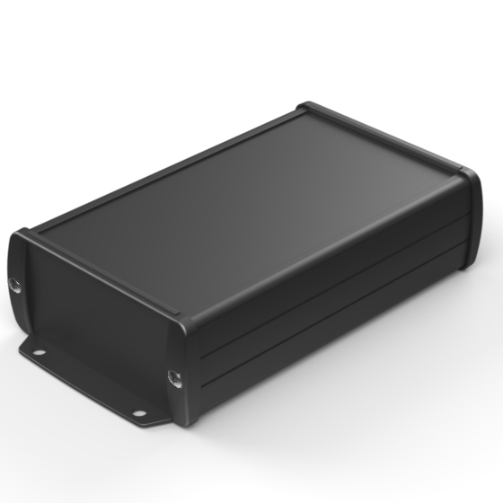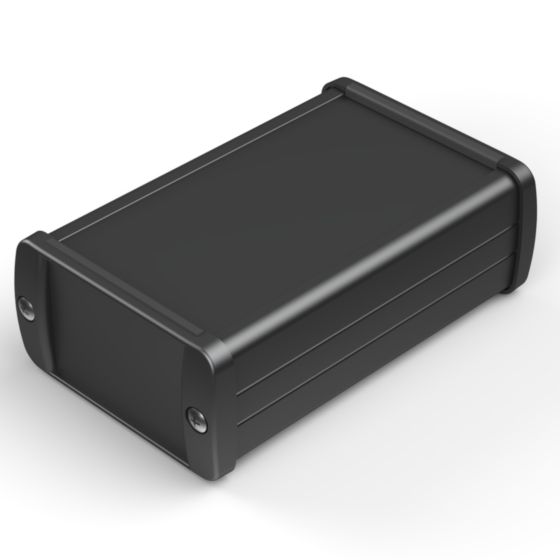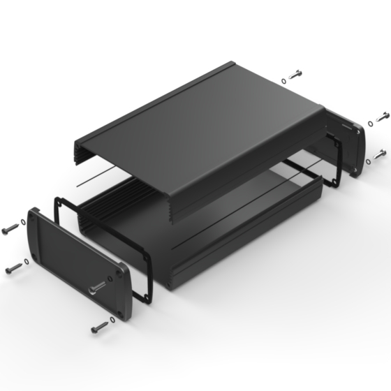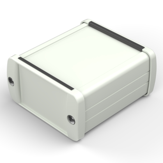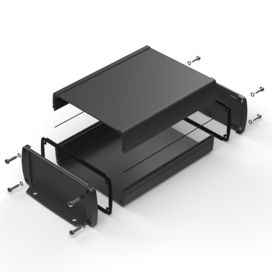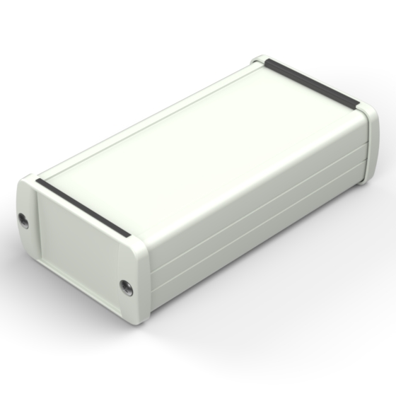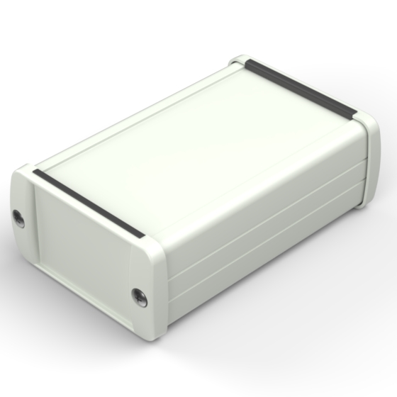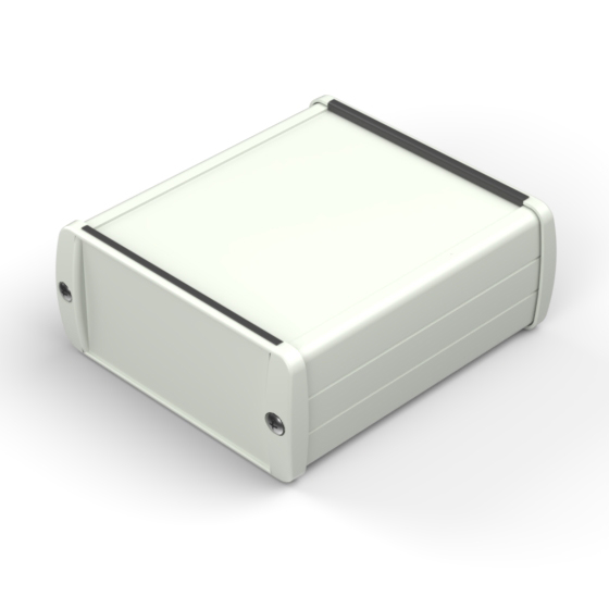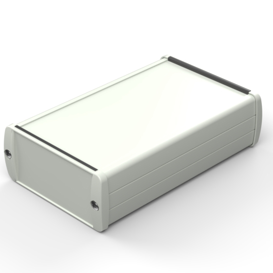 Extruded aluminium case with powder coating and two rubber sealing kits to protect against water and from dust (IP65) available in six different colours. Two metal front panels, internal slots for PCB’s and a recessed area for a keypad membrane. The models with “E” have mounting wall metal panels. Closing by four or eight screws.