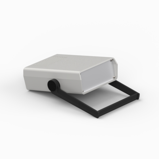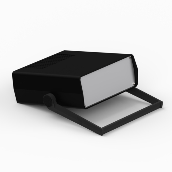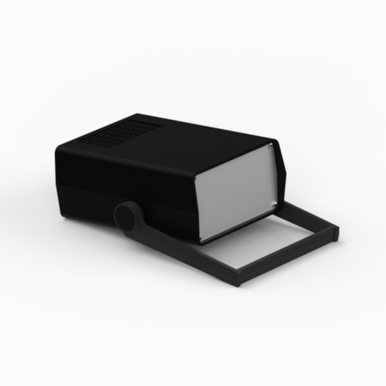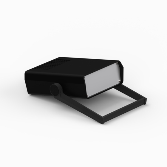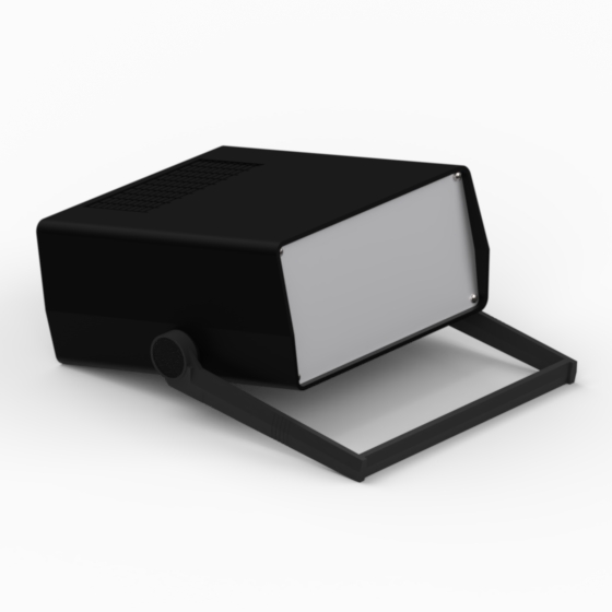 ABS enclosures with a handle that can be locked in any of eight positions and used as a stand. Vented cover and base for aeration. Front and rear 1 mm aluminium panels. Each half-shell has integral PCB guides and mounting studs. Matt surface finish. Closing by eight screws.