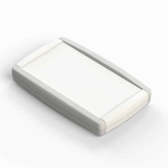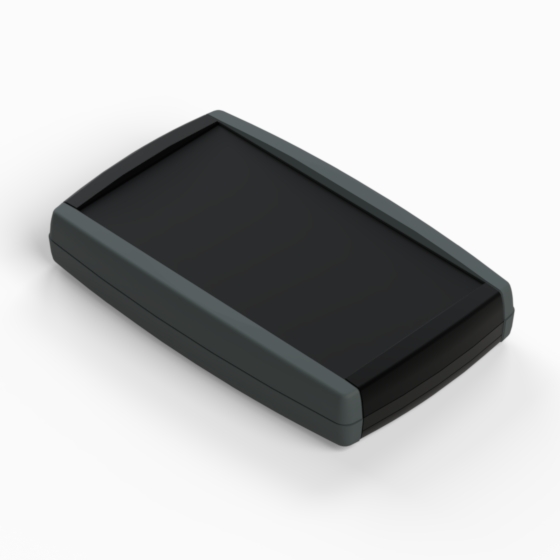 ABS enclosures with new soft-touch contoured shape. By utilising multi-shot moulding technique, Teknet features an ergonomic design of elastomer grips (TPU) on the side of the case. The models with “-B” have a battery compartment for two 1.5V mignon-cells (AA) or one 9V flat battery (PP3). The models with “-B2” have a battery compartment for four mignon cells 1,5V (AA) or two flat batteries 9V (PP3). Matt surface finish. Closing by four screws. Upon request aluminium panel “APTB”, Keypad membrane “M” or “MW” (with transparent display area).