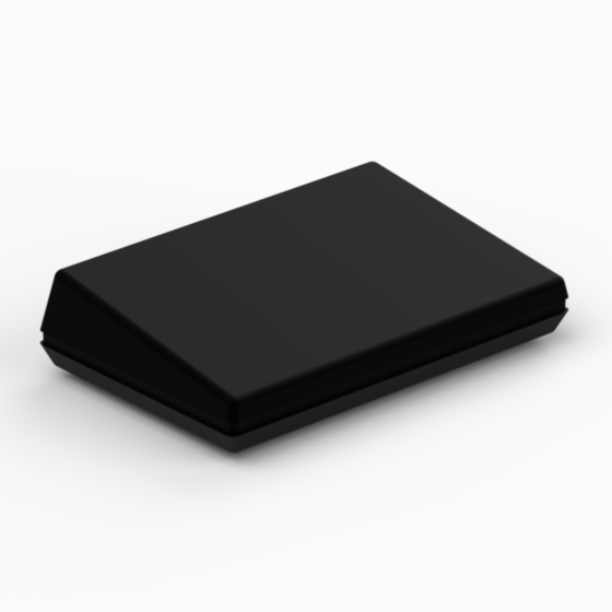 ABS case with inclined cover. The base and the cover have integral PCB mounting studs. Matt surface finish. Closing by four screws.