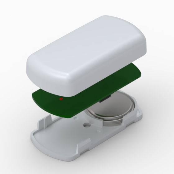 Inside the card case is a slot for a CR2450 button battery (not included). A hole for antitamper switch and a zone permeable to the light of a status led make it suitable for professional use.