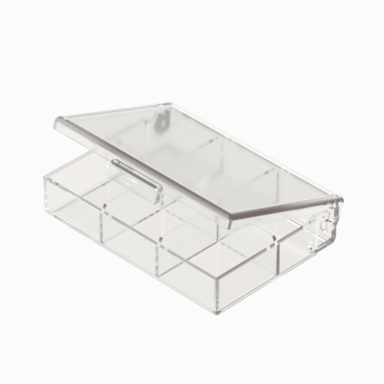 Series of small storage boxes with hinged transparent polystyrene lid. Glossy surfaces finish.