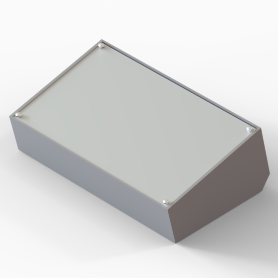 ABS enclosure with a 15° inclined 1mm aluminium panel. The base walls have integral PCB guides and mounting studs. Glossy surface finish. Closing by four screws.