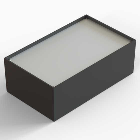ABS enclosures with square corners and glossy surface finish. The base walls have integral PCB guides. P series have 1 mm aluminium panel.
